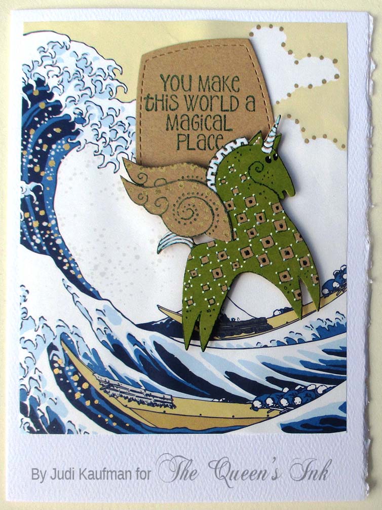This project took shape because of the things that were on my drafting table at the same time. Serendipity, no intentional planning. On one side was a stack of stamped, colored, and die cut unicorns,horses and sentiments waiting to be turned into projects. Fanned out on the other side were some origami papers I brought back from a recent trip to San Francisco where I’d stopped at the famous Japanese import store, Daiso.